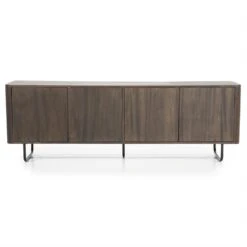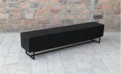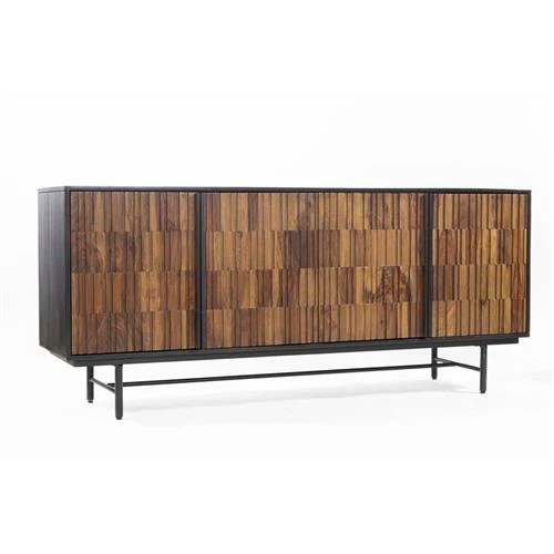 Das Anrichte Dimaro ist ein robustes Möbelstück mit einem einzigartigen Design aus Mangoholz. Das Anrichte hat naturbraune Türen mit unterschiedlichen Stärken, die ihm ein robustes Aussehen mit einem markanten Relief verleihen. Das macht Dimaro zu einer ausgezeichneten Wahl für Liebhaber robuster Inneneinrichtungen. Außerdem ist das Möbelstück in schlichtem Schwarz gehalten und steht auf einem Metallfuß. Diese Kombination schafft einen schönen Kontrast und macht den Schrank auch für moderne Wohnstile geeignet.