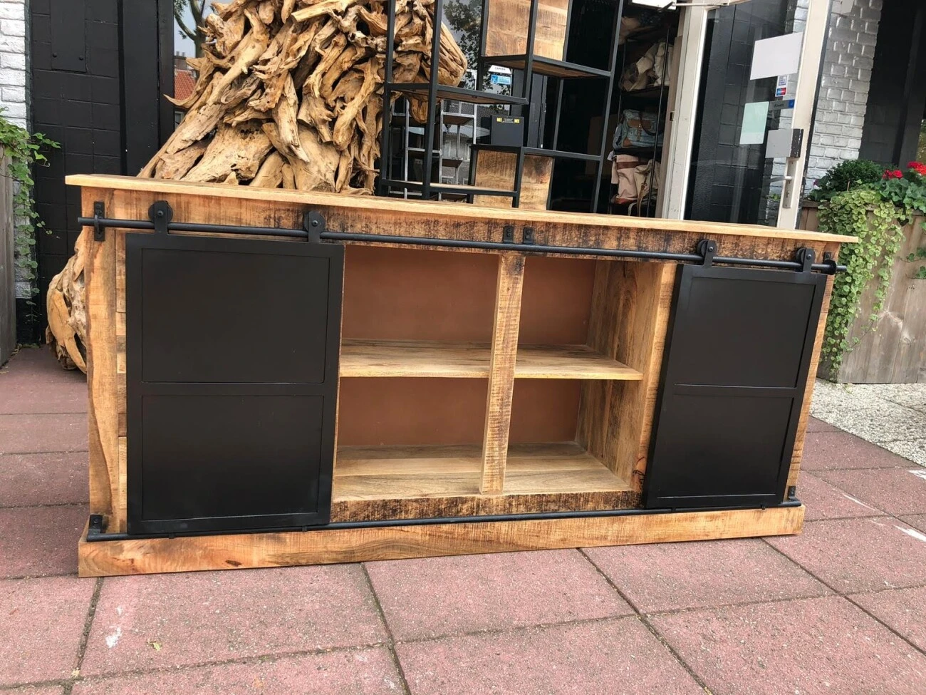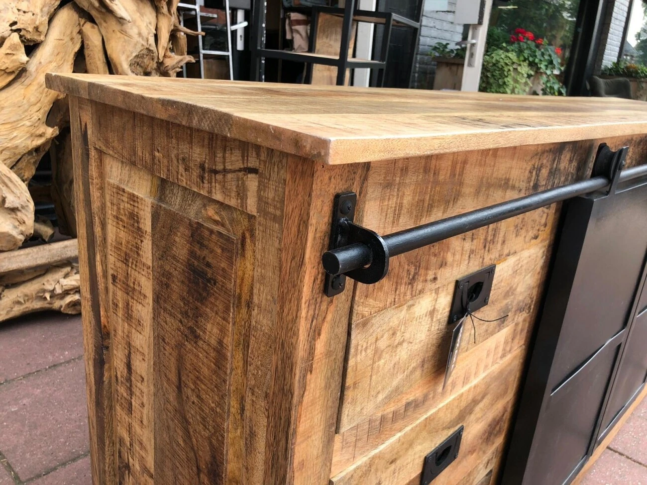 Robustes und widerstandsfähiges Sideboard aus Mangoholz und schwarzem Metall.