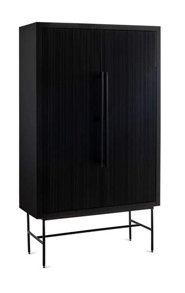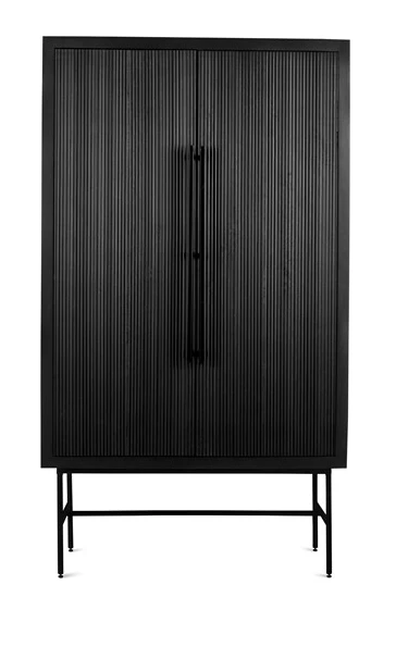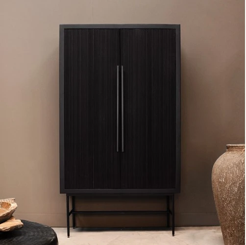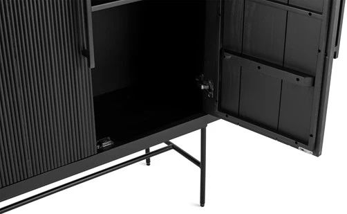 Donau ist ein moderner Aufbewahrungsschrank aus massivem Mangoholz mit schwarzer Oberfläche. Der Schrank ist eine Kombination aus japanischem Design und industriellen Elementen. Die vertikalen Linien an den Türen des Schranks verleihen dem Schrank Einheit und Ruhe. Die Türen und Schubladen sind mit einem Soft-Close-System ausgestattet, das ein leises und sanftes Schließen der Türen und Schubladen ermöglicht. Die Griffe sind vom traditionellen japanischen Design inspiriert. Das minimalistische Design wird durch die schlanken, schwarzen Stahlbeine unterstrichen, die hoch angebracht sind und dem Schrank mehr Raum und Tiefe verleihen.