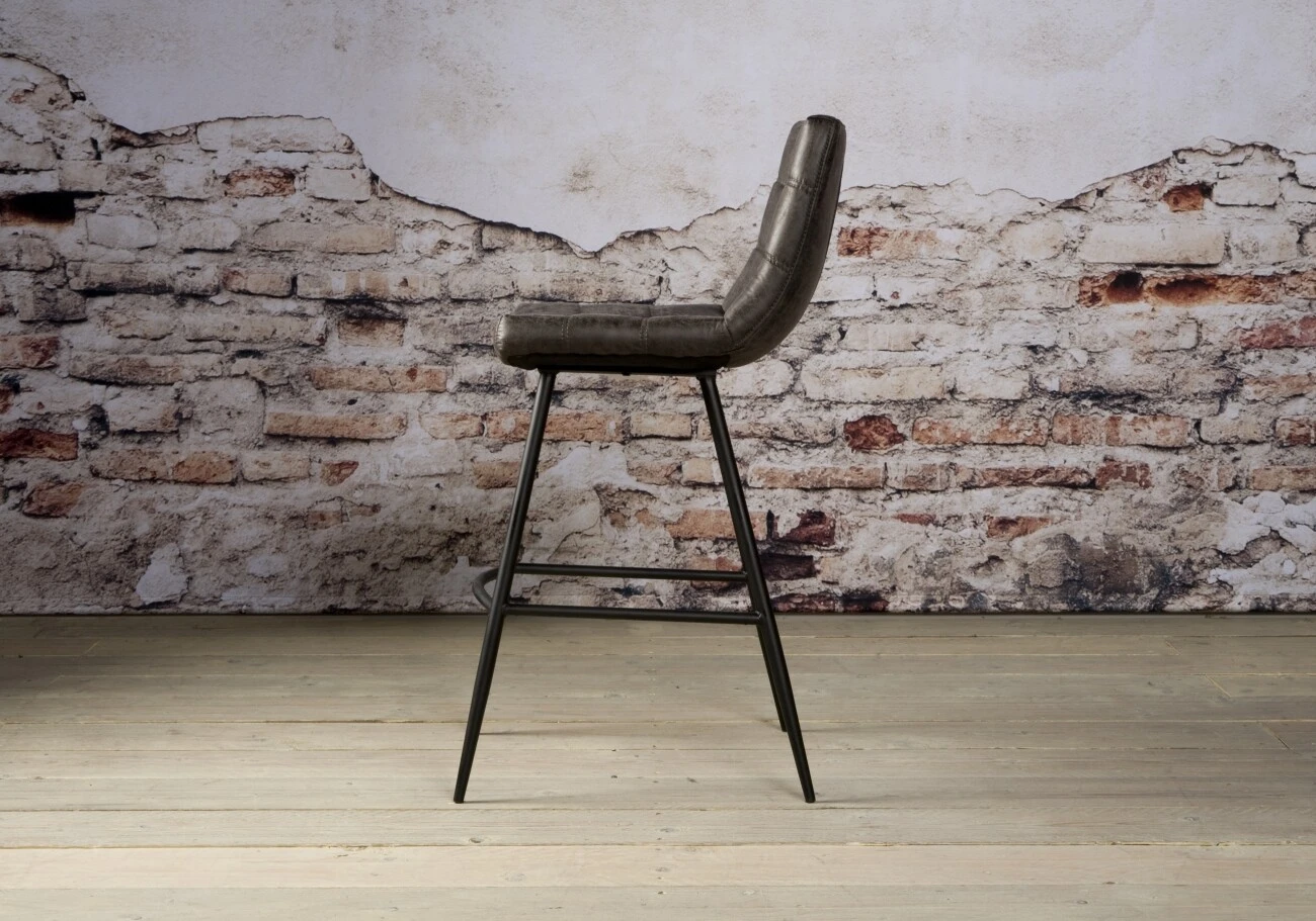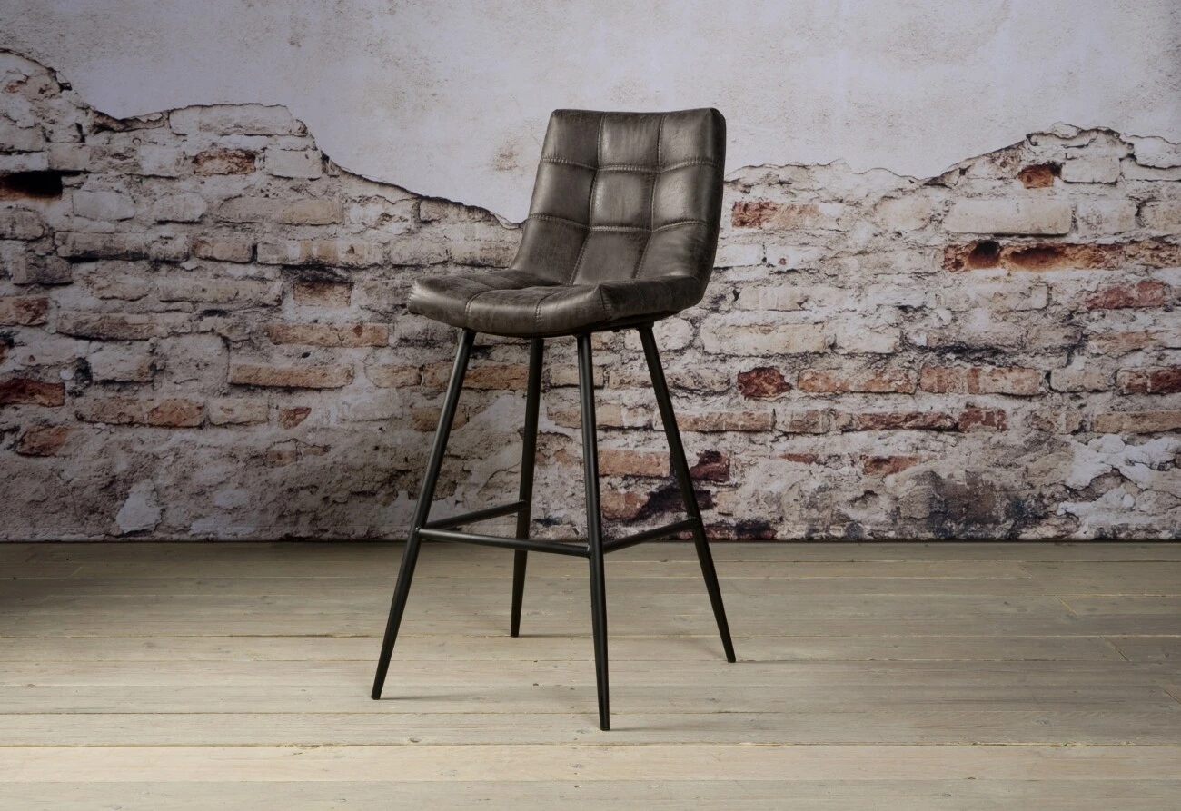 Barhocker Navarra aus der Tower Living Kollektion. Der Stuhl ist mit Stoff gepolstert und hat ein schwarzes Metallbein. Die Nähte in Sitz und Rückenlehne bilden ein robustes Blockmuster. Durch diese Kombination entsteht ein industrieller, rustikaler Look.