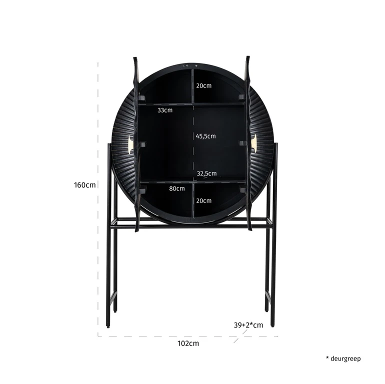Der Barschrank Feda ist ein stilvoller Barschrank aus der Kollektion von Richmond Interiors. Feda hat eine abgerundete Gabel, ist aus Mangoholz und Metall gefertigt und schwarz lackiert. In Kombination mit dem goldenen Knopf in der Mitte ist dies ein auffälliges Element in Ihrer Einrichtung. Der Barschrank verfügt über 2 Türen mit mehreren Einlegeböden dahinter, die viel Stauraum bieten.
