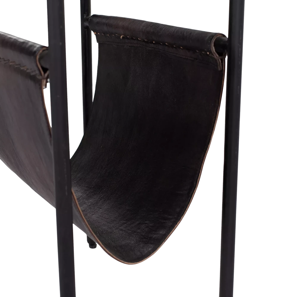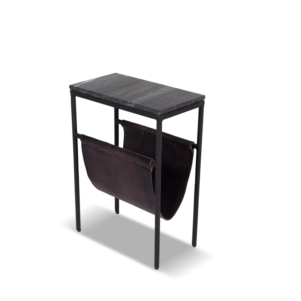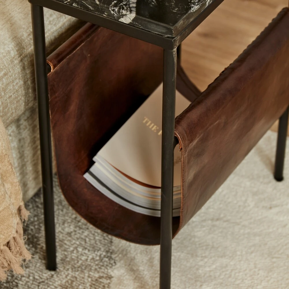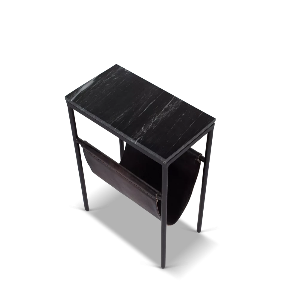 Der Beistelltisch Bow wird aus verschiedenen Materialien hergestellt. Das Gestell ist aus schwarzem Stahl gefertigt. Das Gestell ist mit einer platte aus dunklem Marmor versehen. Dank des robusten, dunkelbraunen Leders ist Bow auch als Zeitschriftenhalter verwendbar. Durch die Verwendung verschiedener Materialien passt Bow gut in moderne, industrielle oder auch rustikale Wohnstile.