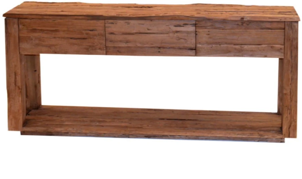 Dieser schöne Beistelltisch cm aus Teakholz ist ein Blickfang in jedem Zuhause. Dieser rustikale Beistelltisch hat einen robusten Look und verfügt über drei Schubladen. Dieser Tisch ist aus recyceltem Teakholz gefertigt. Da das Holz sehr grob ist, fallen die Möbel auf und verleihen Ihrer Wohnung ein robustes Aussehen.