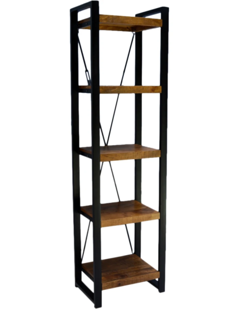 Britt Bücherregal mit offenen Regalen aus Mangoholz und schwarzem Metall.