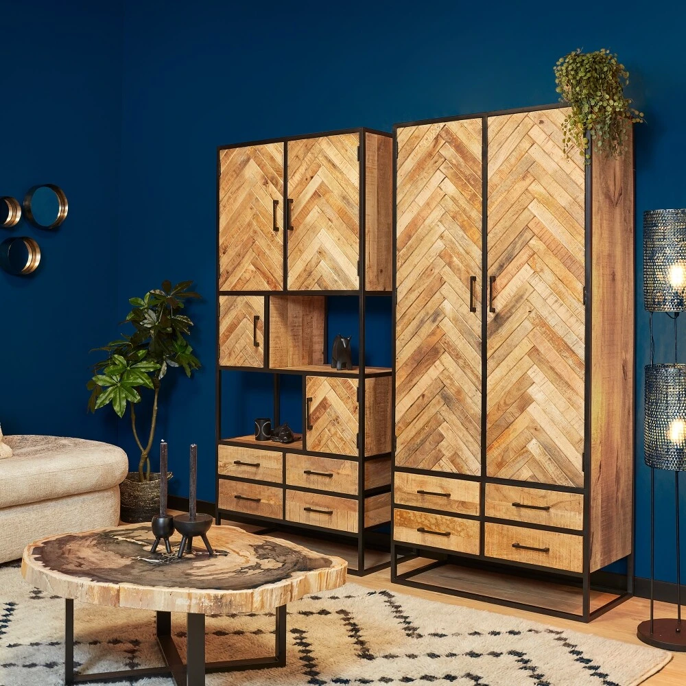 Cabinet Arlington ist ein moderner Schrank aus Mangoholz mit eingelegtem Fischgrätenmuster. Das Gestell und die Griffe des Schranks sind aus Metall gefertigt und schwarz lackiert. Der Schrank hat zwei Türen und 4 Schubladen und bietet somit reichlich Stauraum.
