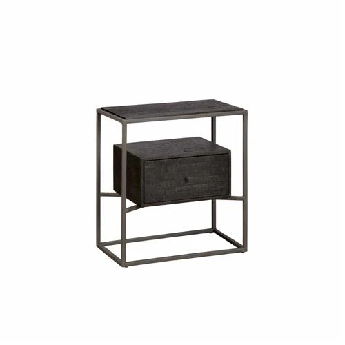 Moderner Sidetable Cascia aus der Tower Living Kollektion. Cascia ist aus recyceltem Teakholz gefertigt und hat einen Metallrahmen. Die Schublade bietet reichlich Stauraum für Ihre Habseligkeiten. Das Design der Möbel in Kombination mit der schwarzen Farbe sorgt für einen modernen und coolen Look.