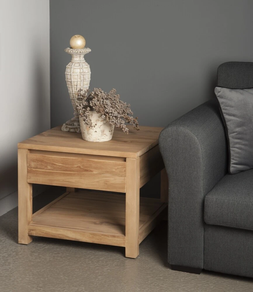 Dieser Beistelltisch aus dem Corona-Wohnprogramm von Tower Living besteht aus unverarbeitetem Teakholz.