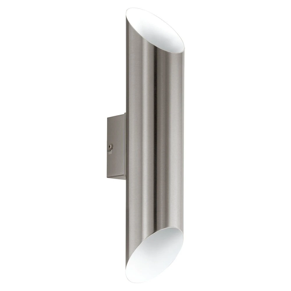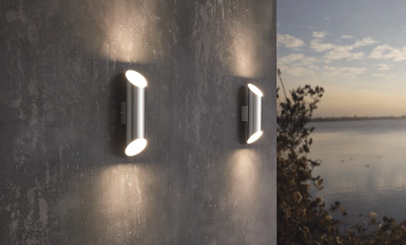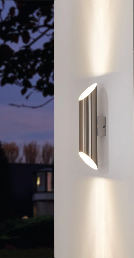 Die Wandleuchte Agolada ist eine moderne Wandleuchte aus rostfreiem Stahl mit weißer Oberfläche in einer runden Form. Die weiße Oberfläche auf der Innenseite verleiht eine warme Atmosphäre. Die indirekte Up-Down-Beleuchtung erzeugt einen schönen Effekt an der Wand.