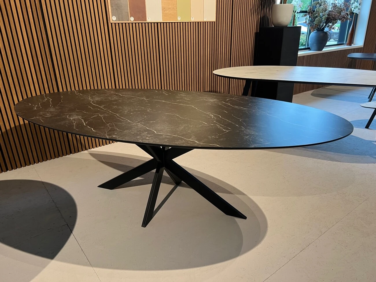 Der Esstisch 1154 ist ein modern gestalteter Esstisch aus HPL. Die Tischplatte hat eine ovale Form und einen facettierten Rand, die Platte ist 2,8 cm dick. Die Platte hat ein Marmor-Finish und einen luxuriösen Look. HPL ist ein sehr starkes und verschleißfestes Material, das auch hohen Temperaturen standhält und somit sehr langlebig ist. Der Esstisch kann mit verschiedenen Oberflächen und Gestellen bestellt werden.