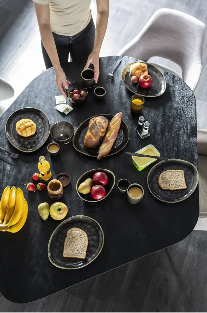 Esstisch Beau ist ein modern gestalteter Esstisch aus der Kollektion von Eleonora. Beau ist ein echter Blickfang in Ihrer Einrichtung. Der Esstisch ist aus Mangoholz mit einer dunkelbraunen Beschichtung gefertigt. Die Tischplatte hat eine organische Form, die zusammen mit den Beinen den Tisch zu einem einzigartigen Element in Ihrem Raum macht.