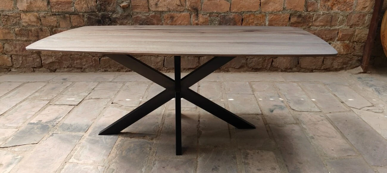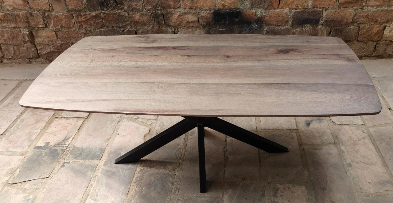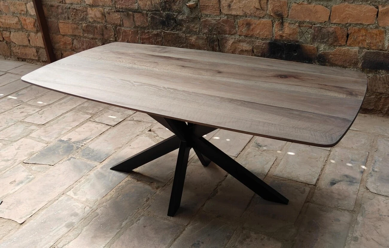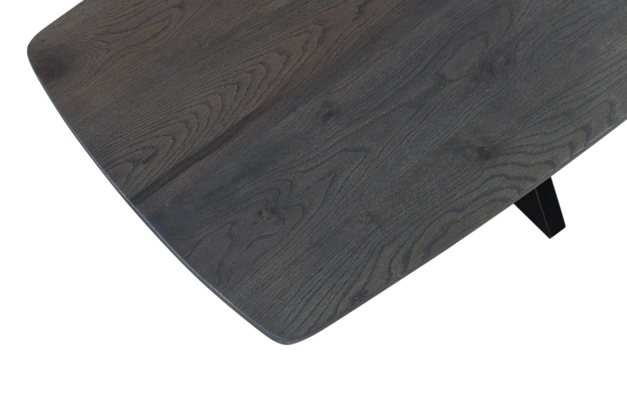 Der Esstisch Oakdale ist ein moderner Esstisch aus massiver Eiche. Die Tischplatte ist grau lackiert und hat die Form eines dänischen Ovals. Oakdale erhält durch die dänische Ovalform und die facettierte Kantenbearbeitung einen modernen Look. Die Tischplatte ruht auf einem schwarzen Spinnenbein aus Metall, das dem Tisch eine praktische Handhabung verleiht.
