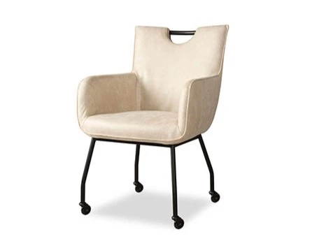 Anouk ist ein modern gestalteter Esszimmerstuhl mit Armlehnen, die einen hohen Sitzkomfort bieten. Außerdem hat der Esszimmerstuhl ein schwarzes Metallgestell und Kufenräder. Anouk ist in verschiedenen Stoffen und Farben erhältlich und passt somit zu vielen Einrichtungsstilen. An der Rückenlehne des Esszimmerstuhls befindet sich ein schwarzer Metallgriff, mit dem Sie den Stuhl leicht zum und vom Tisch schieben können.