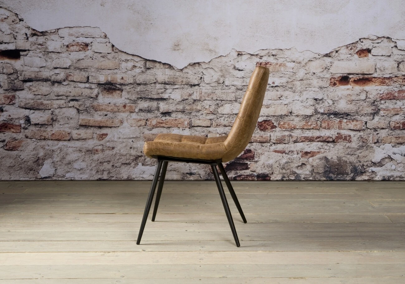 Esszimmerstuhl Navarra aus der Kollektion Tower Living. Der Stuhl ist mit Stoff gepolstert und hat ein schwarzes Metallbein. Die Nähte in Sitz und Rückenlehne bilden ein robustes Blockmuster. Durch diese Kombination entsteht ein industrieller, rustikaler Look.
