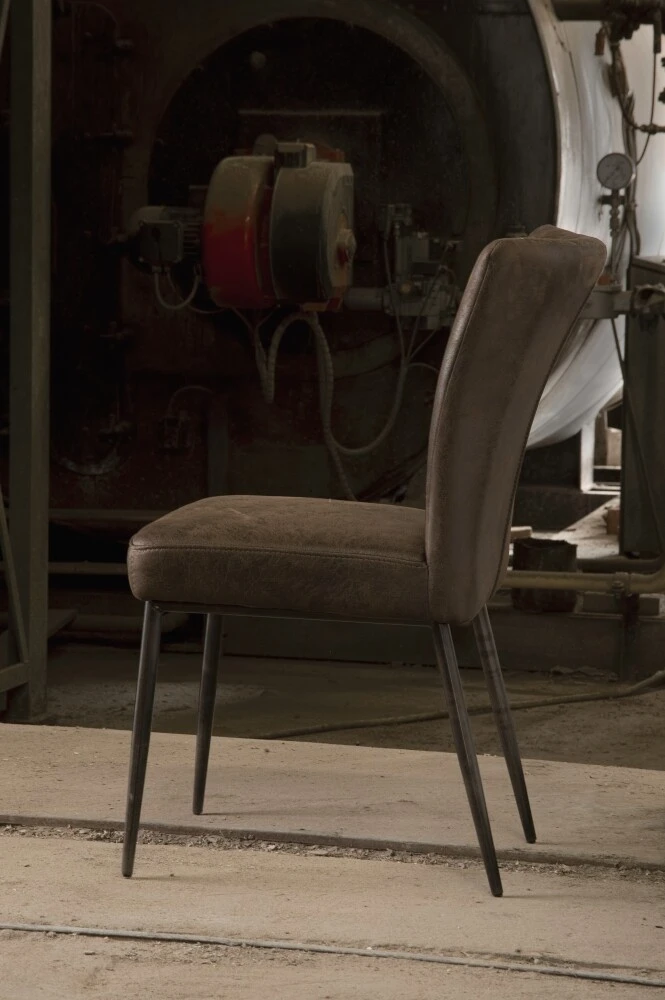 Esszimmerstuhl Toledo aus der Tower Living Kollektion. Der Stuhl ist mit einem Stoff in Lederoptik gepolstert, der ihm einen Vintage-Look verleiht. In Kombination mit den schwarzen Metallbeinen passt Toledo hervorragend in eine robuste, industrielle Einrichtung. Die vertikalen Nähte in der Rückenlehne tragen ebenfalls zum robusten Eindruck bei.