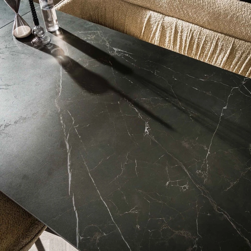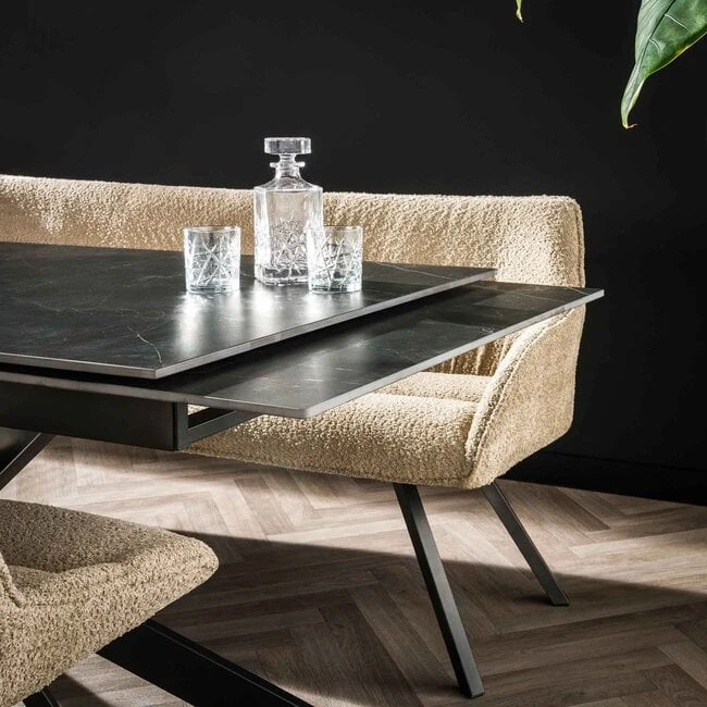 Der Esszimmertisch Dean ist ein schicker Tisch aus schöner schwarzer Keramik. Die Platte wird von einem einzigartigen, modernen Metallbein getragen. Dieser Tisch verfügt über eine sehr praktische Verlängerungsfunktion. Dean ist standardmäßig 180 cm lang, aber durch Verlängern der Tischplatte können Sie den Tisch problemlos auf 260 cm verlängern. Ein perfekter Tisch für jede Gelegenheit.