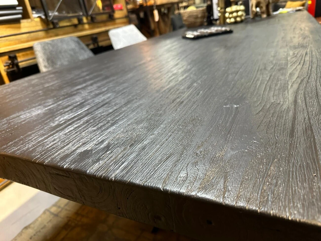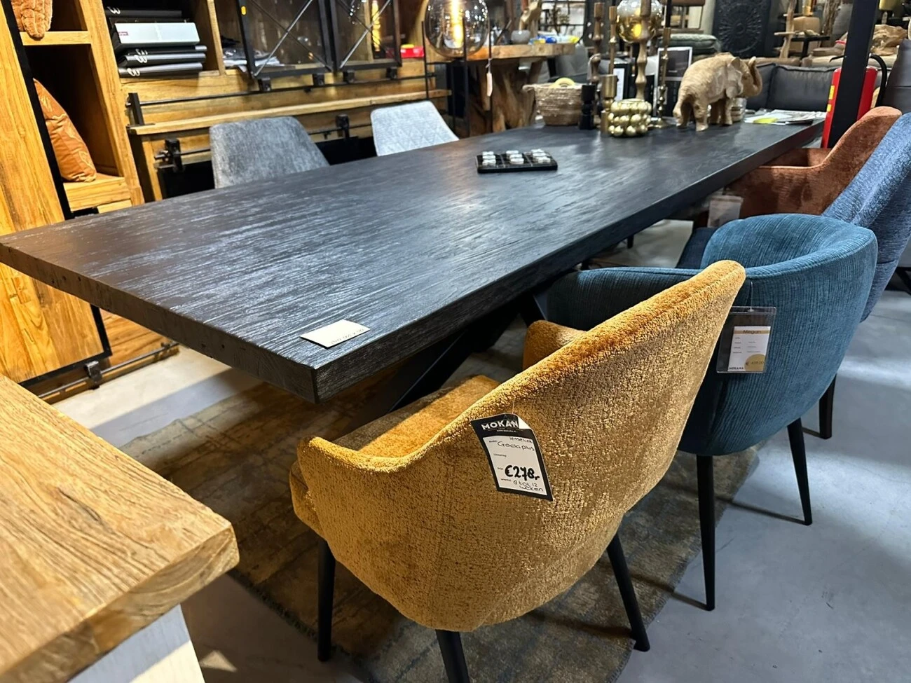 Esstisch Donny ist ein robuster Esstisch aus massivem Teakholz. Die Platte des Esstisches hat eine Stärke von 8 cm. Die Platte wird von einem Spinnenbein aus schwarzem Metall getragen. Die Kombination der Materialien macht den Tisch sehr geeignet für einen industriellen oder modernen Wohnstil.