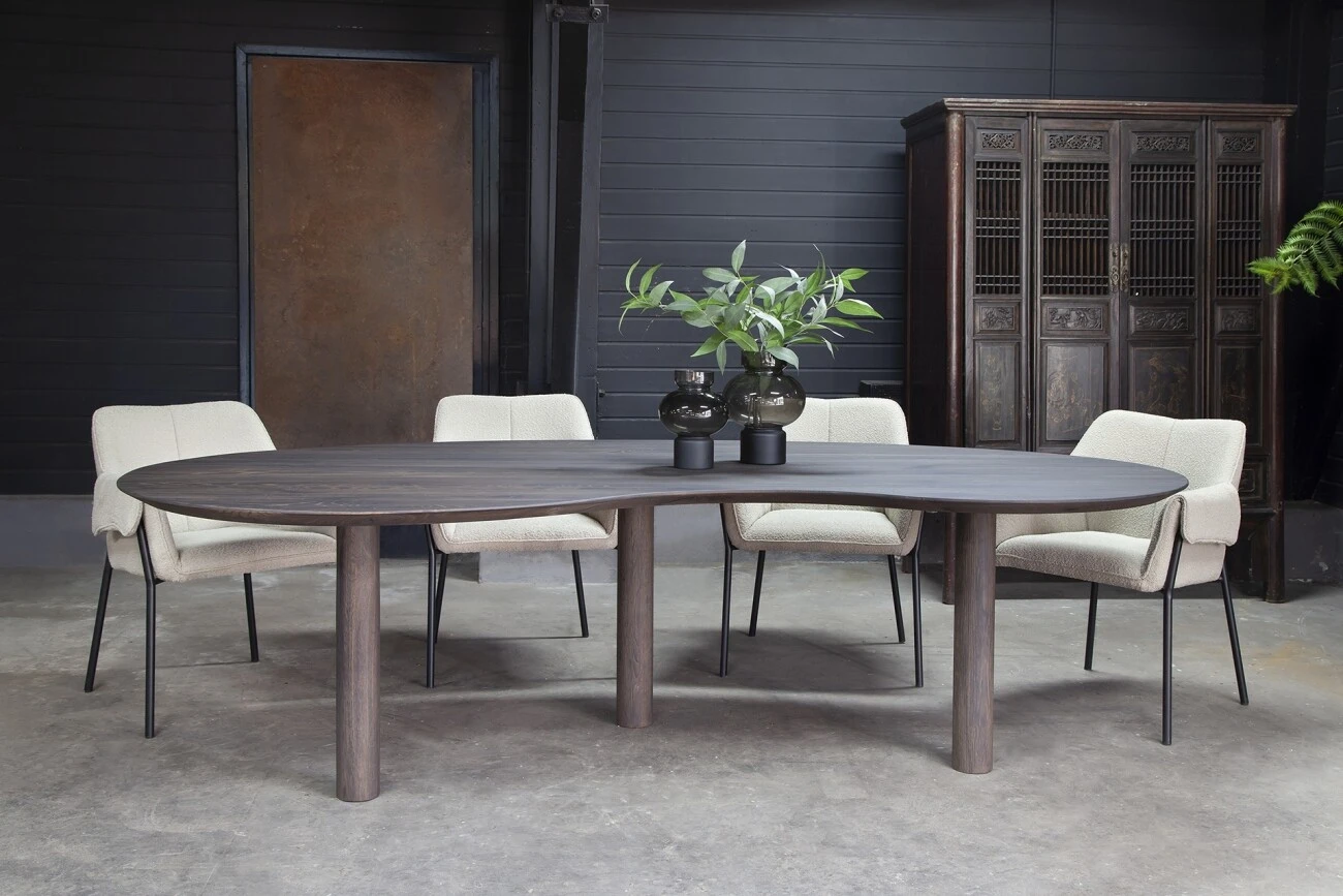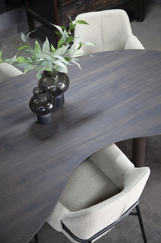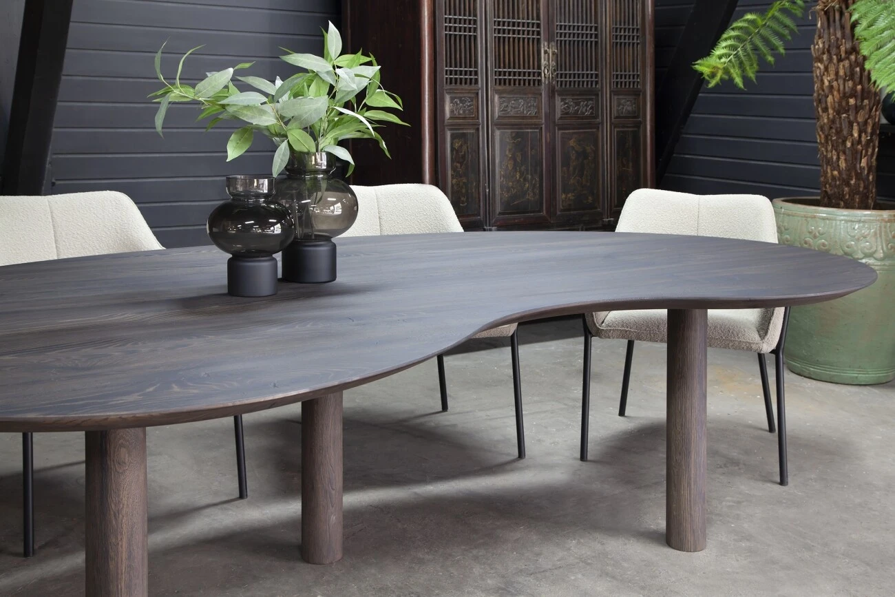 Esstisch Edolo ist ein modern gestalteter Esstisch aus zertifizierter und massiver Eiche, der von Hand bearbeitet wird. Die organisch geformte Platte in Kombination mit der facettierten Kante verleihen dem Esstisch ein modernes Aussehen. Edolo hat 3 Beine aus massiver Eiche.