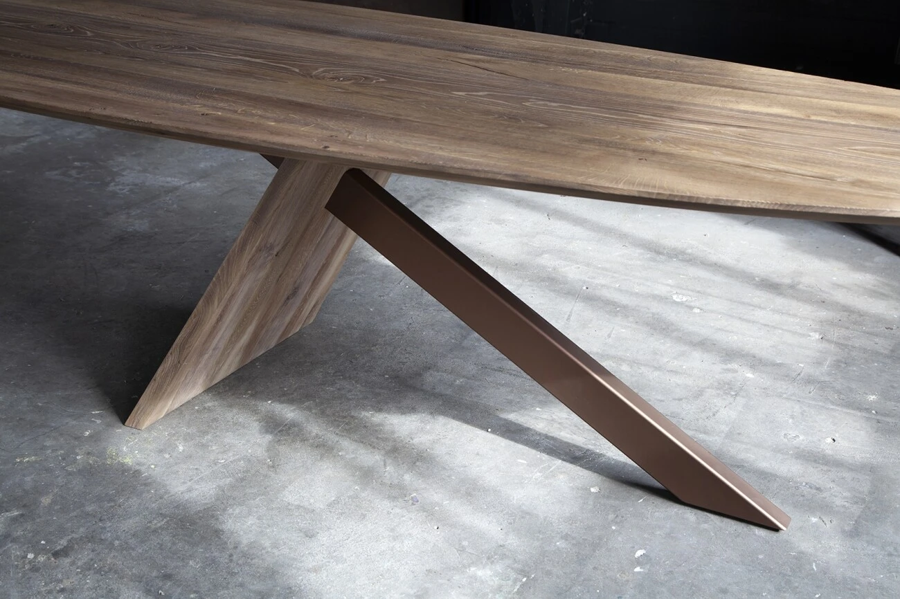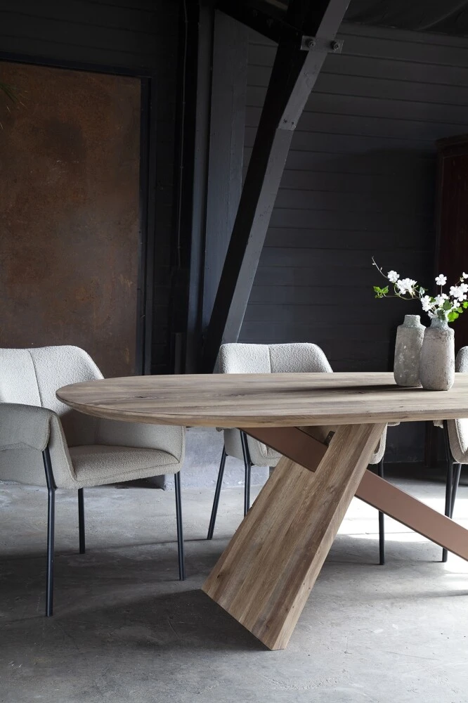Der Esstisch Induno ist ein modern gestalteter Esstisch aus zertifizierter und massiver Eiche, der von Hand bearbeitet wird. Die tropfenförmige Platte in Kombination mit der facettierten Kante verleiht dem Tisch ein modernes Aussehen. Induno hat ein markantes Tischbein aus Eiche und Stahl, das in verschiedenen Farben ausgeführt werden kann.