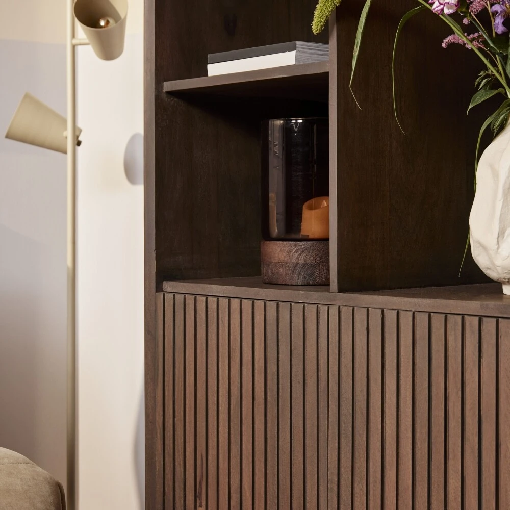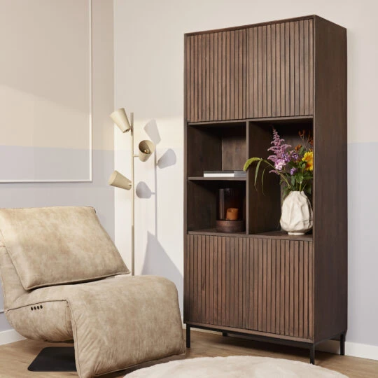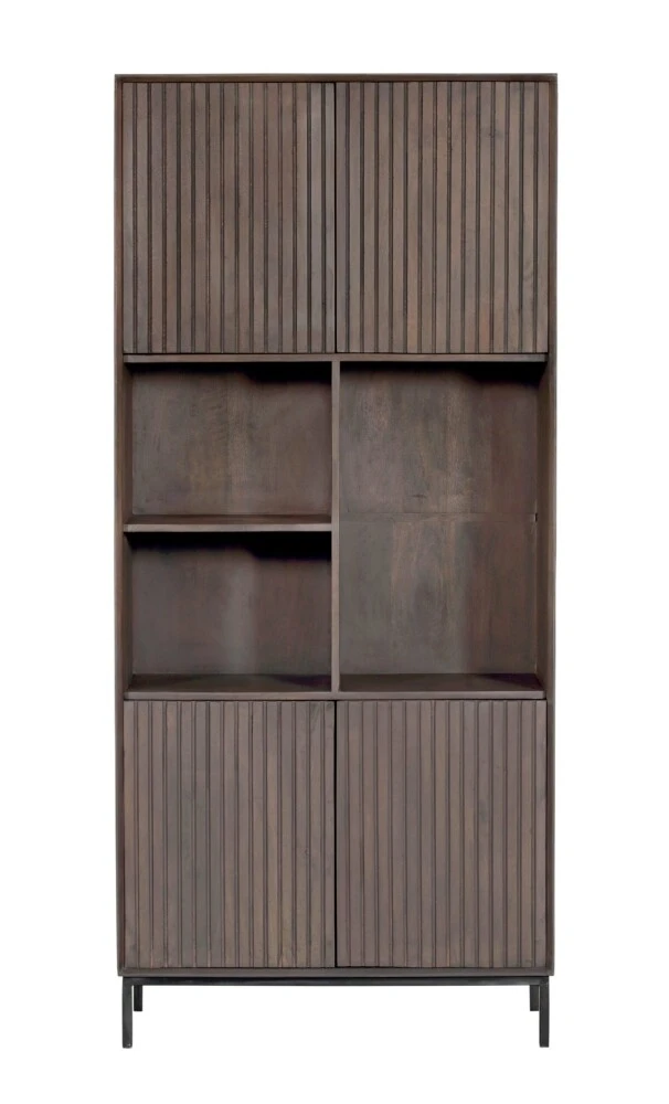 Der Tablettschrank Madison ist ein stabiler Schrank aus Mangoholz. Der Metallrahmen ist mit braunem Lack lackiert. Die Türen aus Mangoholz haben ein vertikales Lamellenmuster und sind ebenfalls braun lackiert. Das Design und die Farbe machen es einfach, ihn mit einem modernen oder industriellen Wohnstil zu kombinieren. Das vertikale Muster lässt den Schrank auch in einem Retro-Wohnstil gut aussehen. Darüber hinaus bietet dieses Möbelstück durch 3 offene Fächer und 4 Türen verschiedene Aufbewahrungsmöglichkeiten.