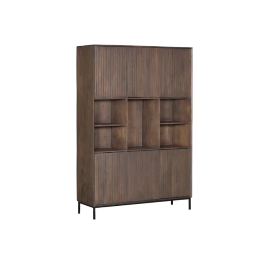 Der Tablettschrank Madison ist ein stabiler Schrank aus Mangoholz. Der Metallrahmen ist mit braunem Lack lackiert. Die Türen aus Mangoholz haben ein vertikales Lamellenmuster und sind ebenfalls braun lackiert. Das Design und die Farbe machen es einfach, ihn mit einem modernen oder industriellen Wohnstil zu kombinieren. Das vertikale Muster lässt den Schrank auch in einem Retro-Wohnstil gut aussehen. Darüber hinaus bietet dieses Möbelstück durch 5 offene Fächer und 6 Türen verschiedene Aufbewahrungsmöglichkeiten.
