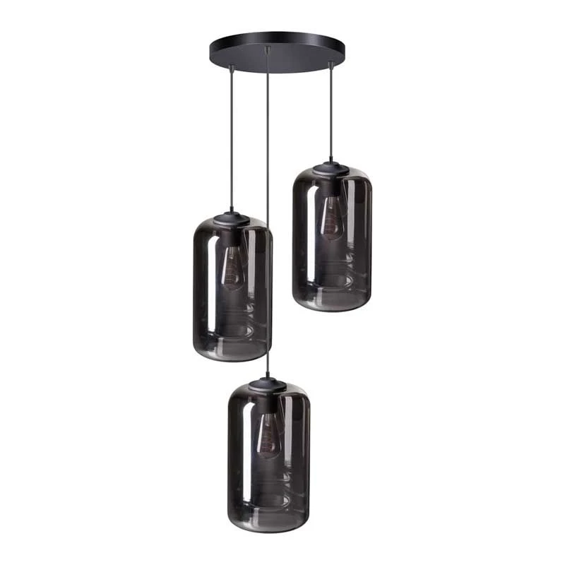 Der Anhänger ist aus schwarzem Metall gefertigt. Der Glasschirm ist aus Rauchglas, das gibt der Lampe noch mehr Atmosphäre. Die 3 Glasschirme unterscheiden sich in der Höhe, was einen spielerischen Effekt erzeugt.