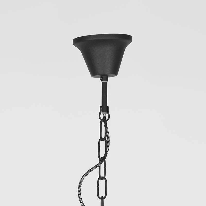 Hängeleuchte Spot ist eine industrielle Hängeleuchte mit einem großen runden Lager aus schwarzem Metall. Ein dekorativer Bügel ist mit robusten Schrauben über dem Schirm befestigt. Der Korb unter dem Schirm erzeugt einen schönen Lichteffekt, wenn die Lampe eingeschaltet ist. Über dem Schirm ist ein dekorativer Bügel mit robusten Schrauben befestigt, durch den eine massive Kette für einen besonders robusten Effekt hängt.