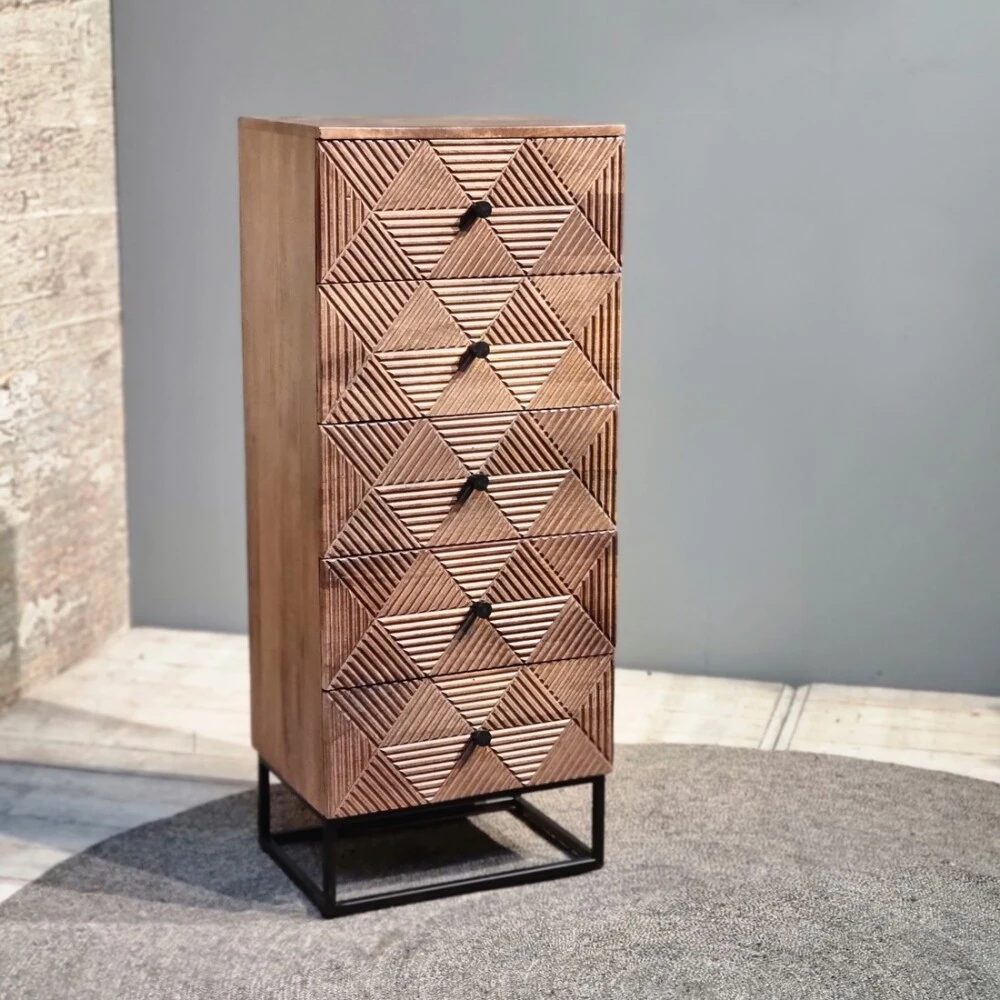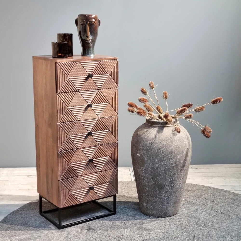 Die Kommode Jasmin ist ein Möbelstück mit einem schönen grafischen Design. Die Möbel sind aus massivem Mangoholz gefertigt und haben eine dunkle Oberfläche. Das grafische Design verleiht den Möbeln ein Retro-Gefühl. Die Kommode verfügt über 5 Schubladen, die viel Stauraum bieten.