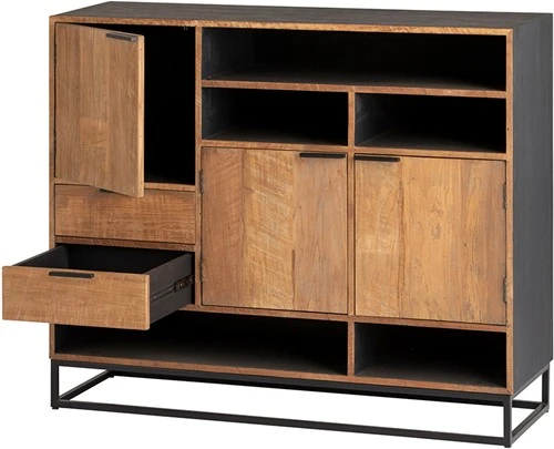 Der Barschrank Milano ist ein echter Blickfang in Ihrem Wohnzimmer. Hinter diesem Schrank können Sie ganz einfach alle Ihre Getränke verstauen. Der Industrieschrank ist 140 cm breit und hat 3 Türen, hinter denen Sie Flaschen oder anderes Zubehör verstauen können. Mit den zwei Schubladen haben Sie genügend Stauraum für Ihre gesamte Verwaltung. Der Teakholzschrank hat einen Metallrahmen und die Metallgriffe sind schwarz lackiert. Die Industriemöbel aus der Milano-Kollektion verleihen Ihrem Zuhause Charakter.