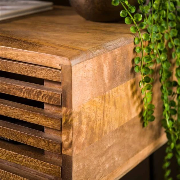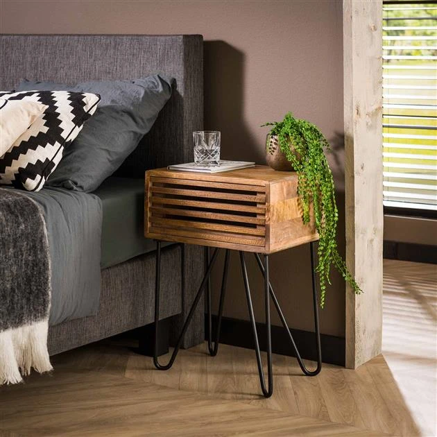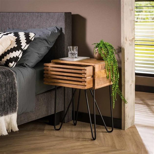 Der Nachttisch Tweak ist ein moderner Nachttisch aus Mangoholz und Metall. Die Schublade hat ein horizontales Linienmuster, das in Kombination mit dem Material einen Retro-Look erzeugt. Ein echter Blickfang für jedes Schlafzimmer.