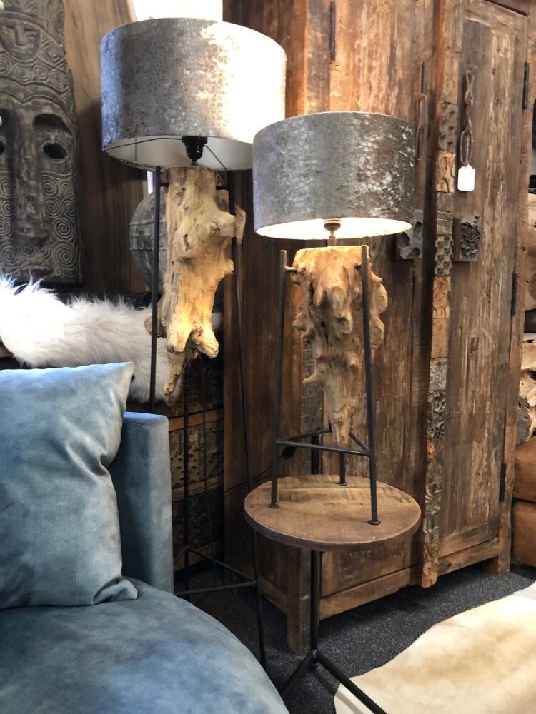 Einzigartige Baumstammleuchte mit schwarzen Metallbeinen inklusive Kroko Lampeschirm.