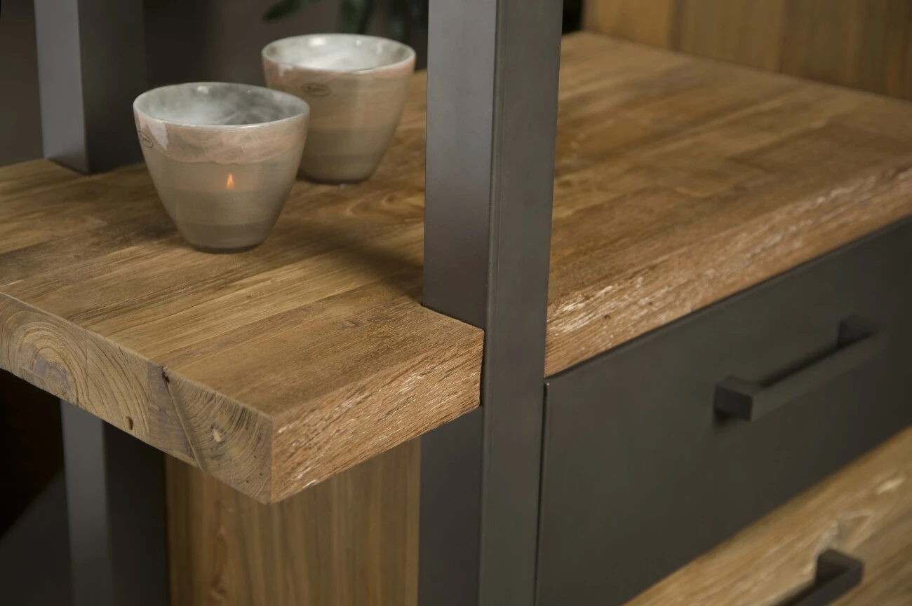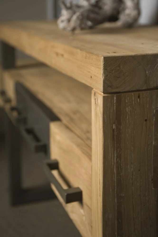 Wunderschöner Beistelltisch Lucca mit 5 Schubladen, recyceltes Teakholz mit Metallbeinen.