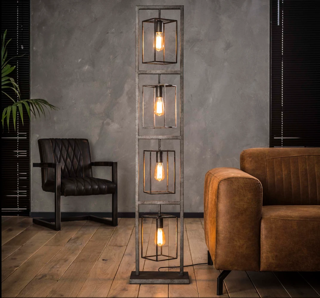 Coole Stehleuchte Kubus Toren mit Metall und Altsilberakzenten. Die offenen Schirme sind drehbar und geben Ihrem industriellen Interieur einen spielerischen Effekt.