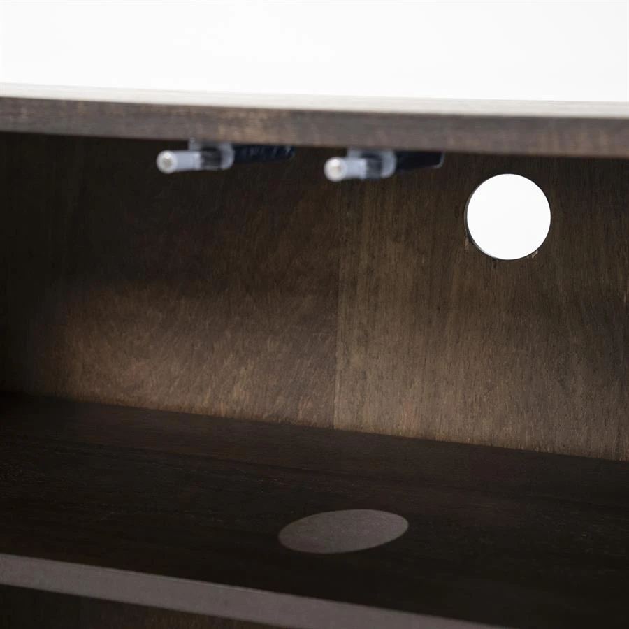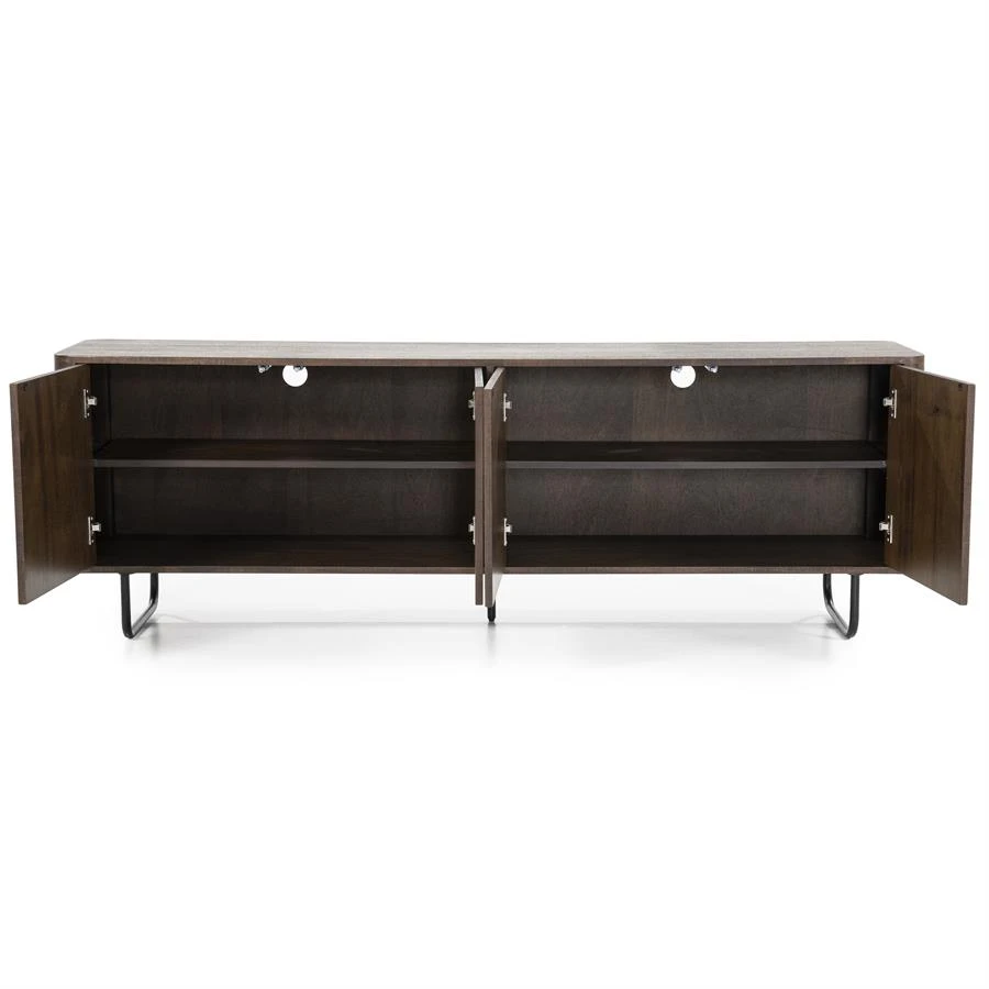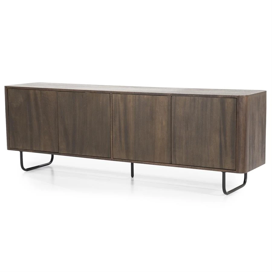 James ist ein modernes TV-Schrank aus der Kollektion von Eleonora. Die Anrichte ist aus Mangoholz und Metall gefertigt. Das Mangoholz hat eine dunkelbraune Oberfläche und abgerundete Ecken. James steht auf schwarzen Metalltüren und hat drei Schubladen und Türen mit Soft-Close-Schließung.