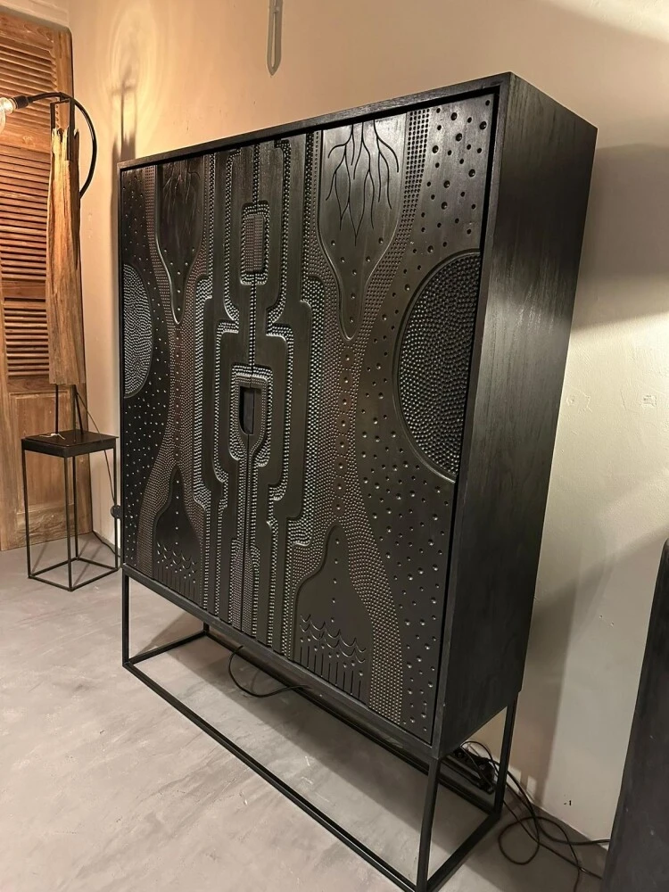 Der Wandschrank Graphic hat ein einzigartiges Aussehen und ist handgeschnitzt aus Indonesien. Graphic ist aus Teakholz gefertigt und hat 2 Türen und einen Metallsockel. Sein einzigartiges grafisches Design macht ihn zu einem echten Blickfang in Ihrer Einrichtung!
