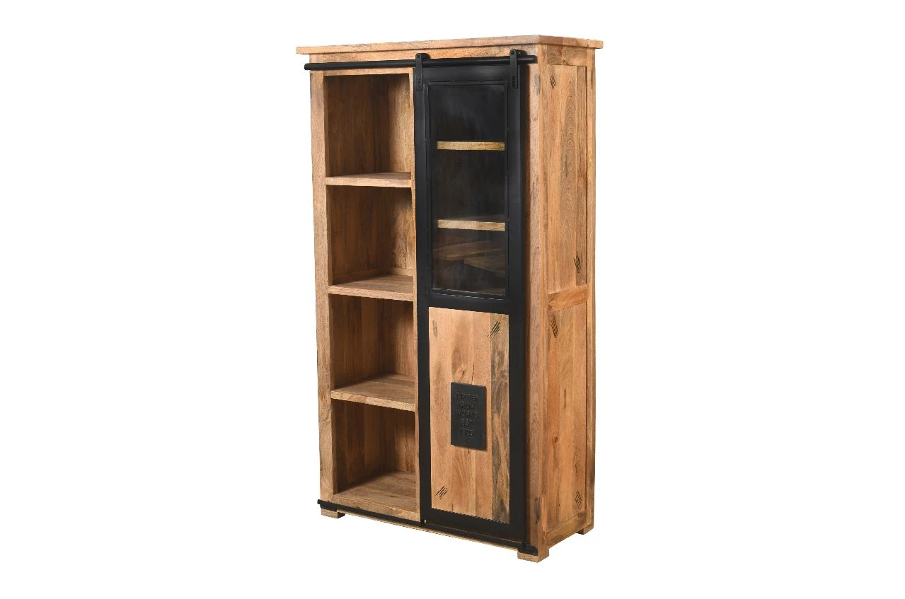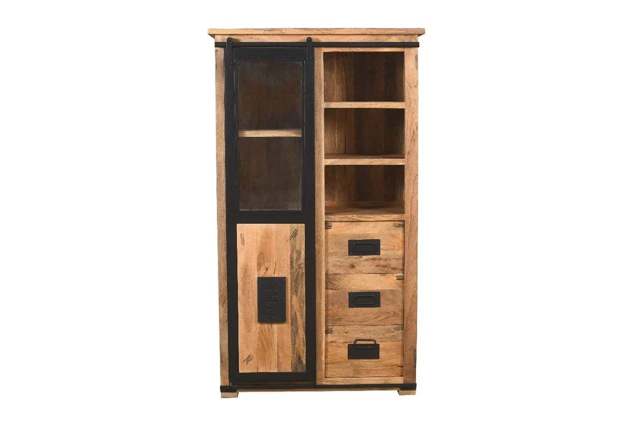 Robuster und industrieller Works-Wandschrank aus massivem Mangoholz. Mit der Schiebetür ist der Works-Wandschrank ein echter Blickfang in Ihrer industriellen Einrichtung. Außerdem ist es äußerst praktisch, alle Ihre Dinge dahinter in den vielen Staufächern und schubladen zu verstauen.