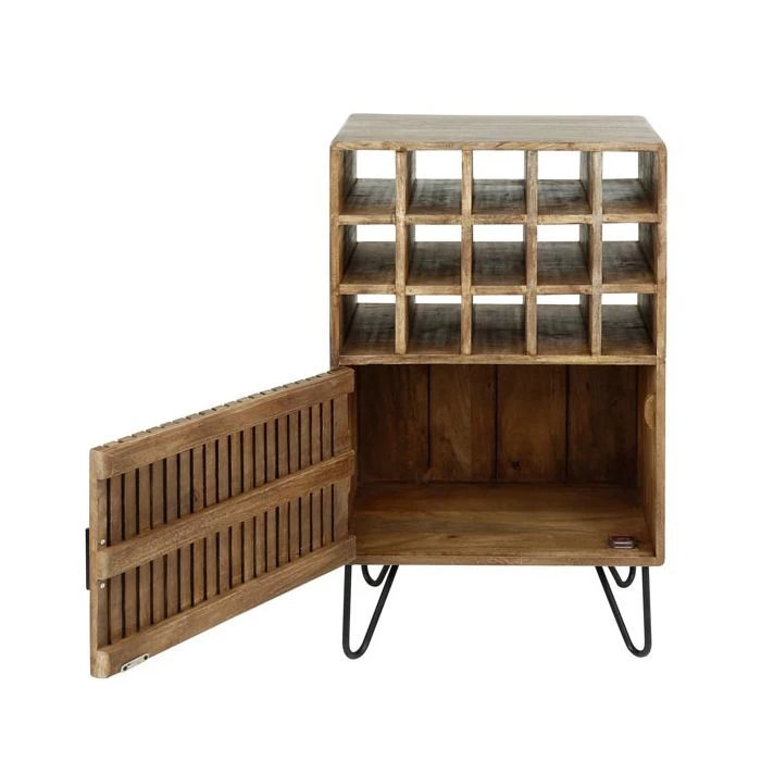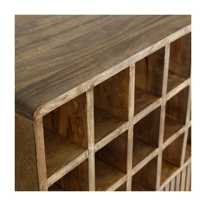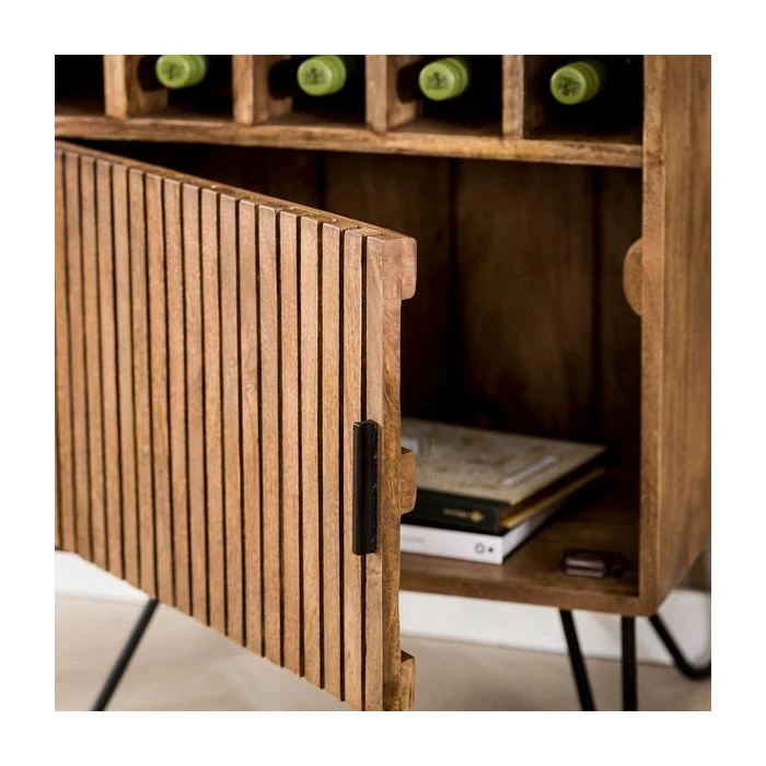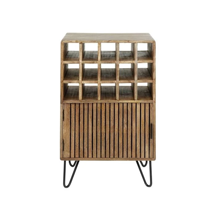 Der Weinschrank Tweak ist aus Mangoholz gefertigt und sandfarben lackiert. Er hat 15 Weinfächer und eine Tür zur geschlossenen Aufbewahrung. Die Tür hat ein vertikales Linienmuster, das in Kombination mit dem Material einen Retro-Look erzeugt.